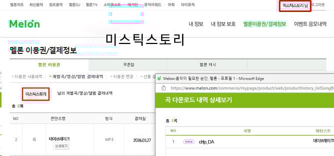 2. 음원 사이트 ID, 다운로드 날짜, 개별곡 여부가 보이게 캡쳐한다
